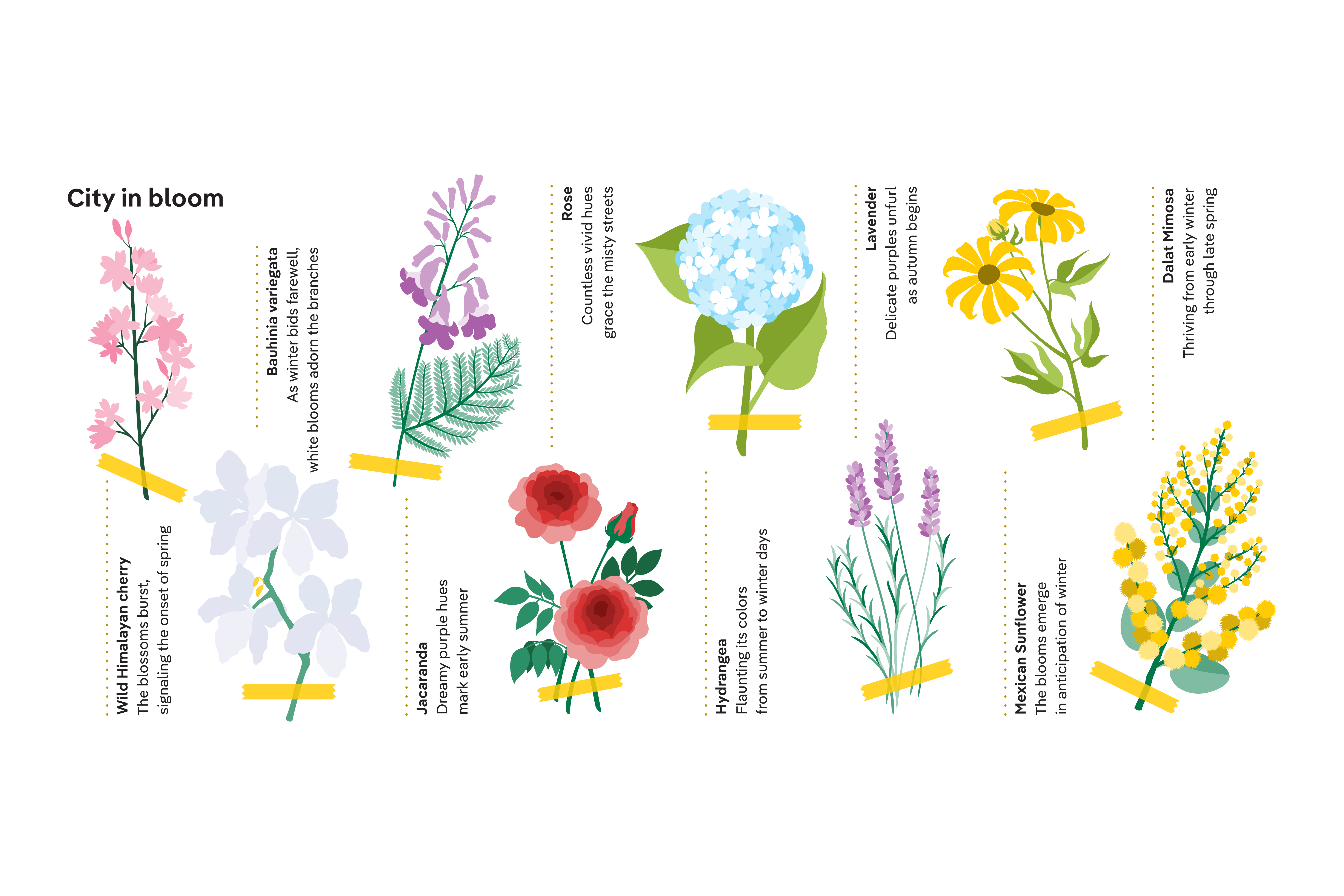 Alongside navigation, the guide includes curated trip suggestions, local stories, and lesser-known facts about Đà Lạt. It also pays tribute to the city’s signature blooms, weaving its iconic flowers into the design as quiet commemorations of seasonality and place.