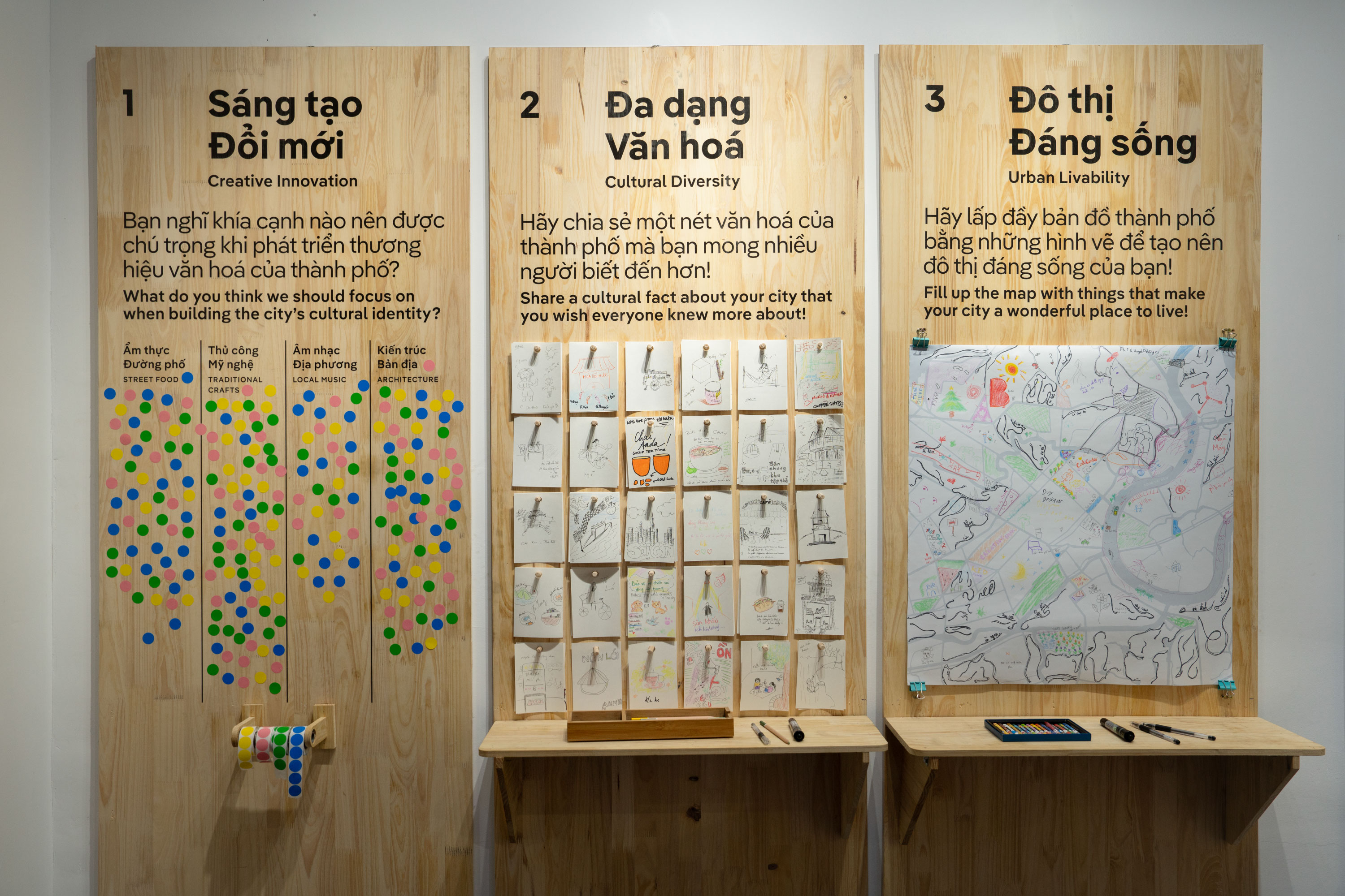 Alongside this, a second section invited attendees to share their visions of what makes a Creative City through simple, playful interactions of sketching, doodling, and writing. Together, the two parts fostered dialogue across communities and urban identities throughout Vietnam.